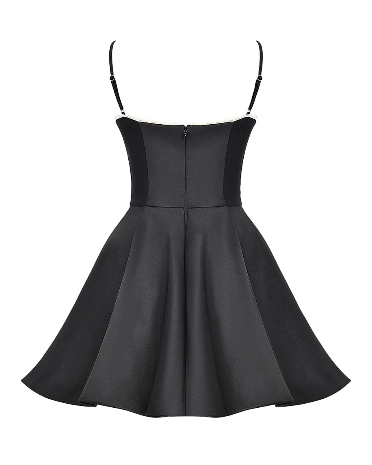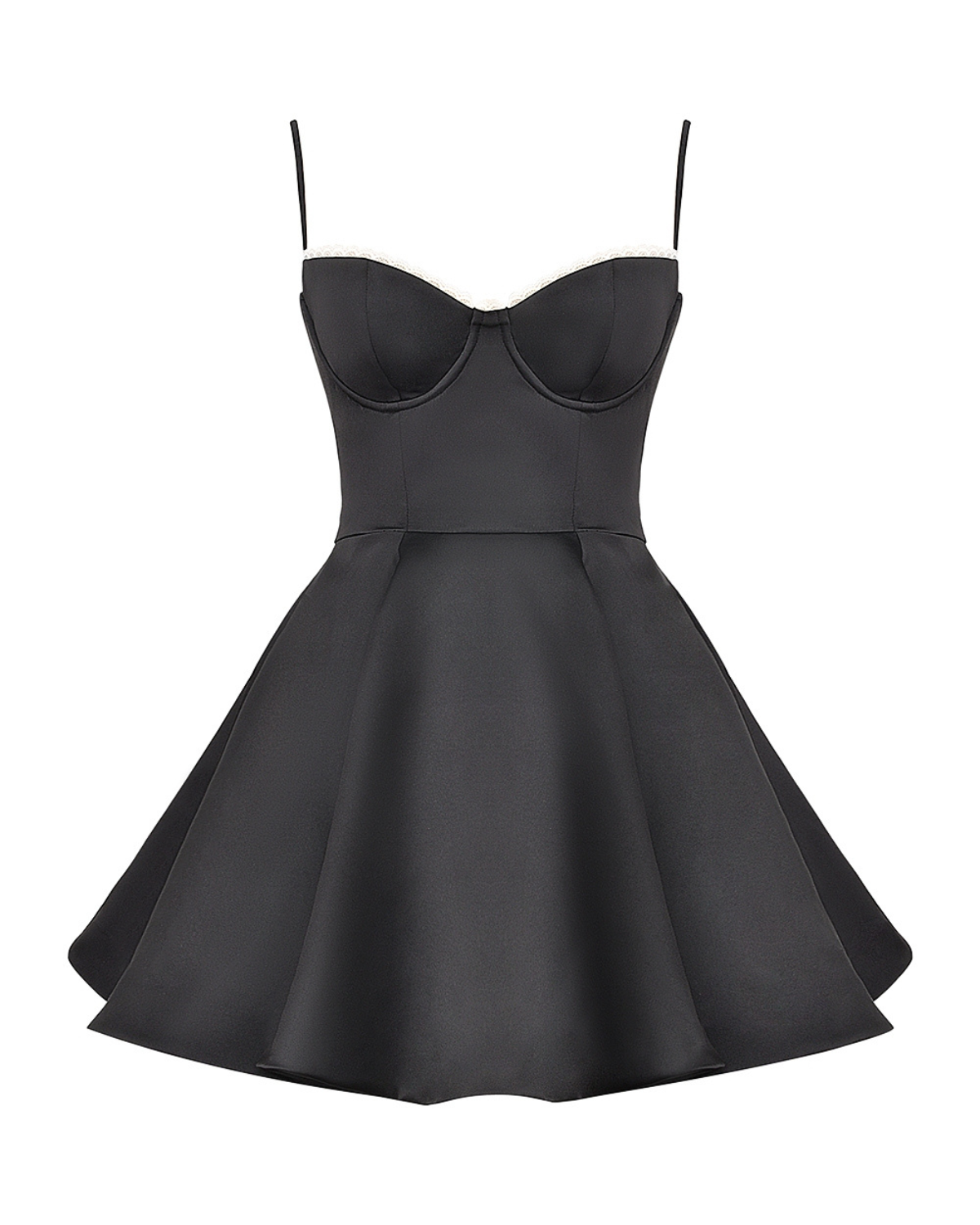 Scopri la magia del mini vestito 'Selene', una creazione da favola perfetta per ogni occasione speciale. Il corpetto rinforzato slancia la vita e presenta un elegante scollo a cuore con coppe imbottite.